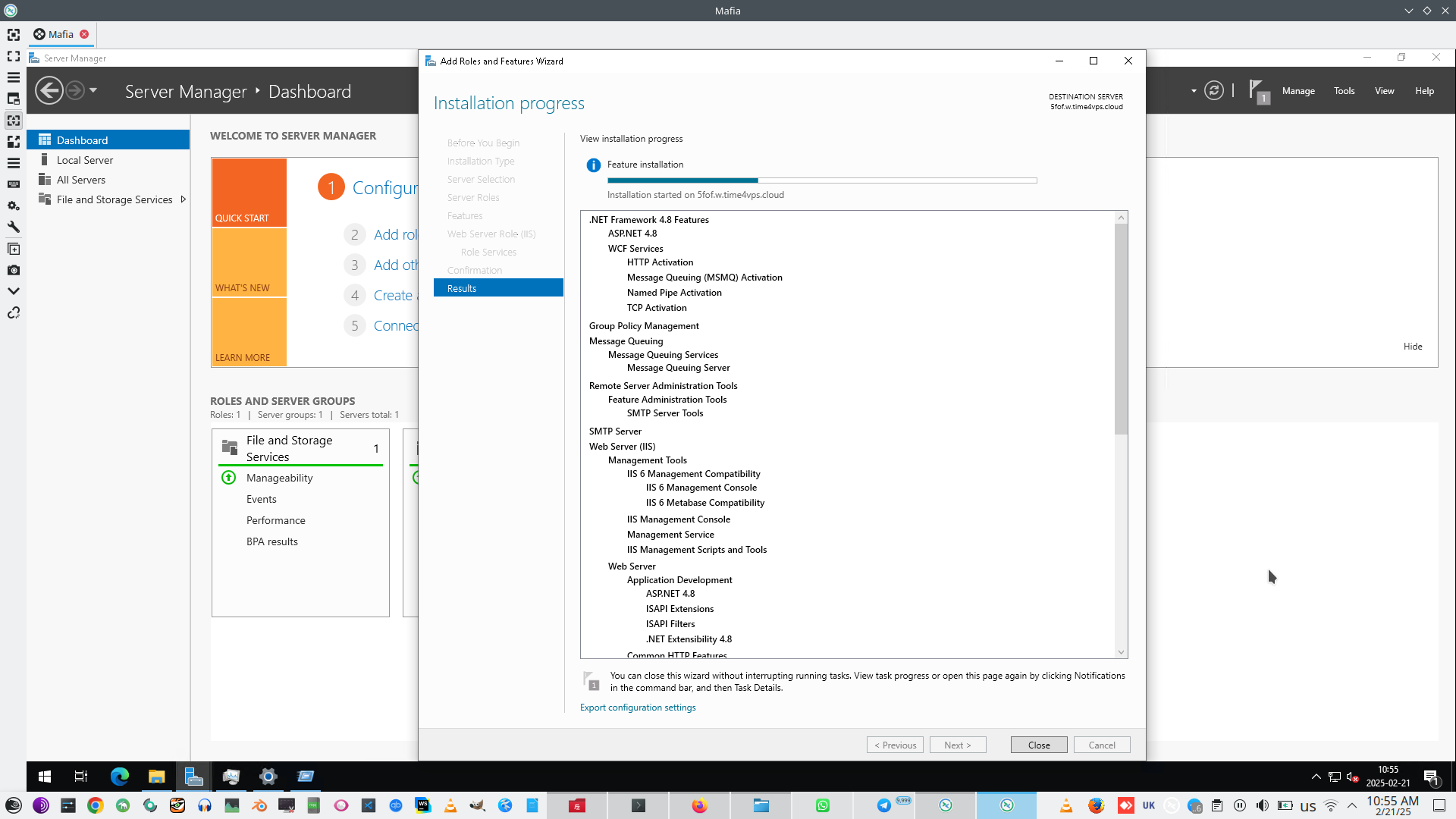 (19) Small interesting point in this installation was that (despite my login named "Administrator") in reality, in datacenter policy this was only as ordinary user account. Therefore I need create special configuration to SQL server. As usually, I have installed MS SMS to server, but in common case this is not mandatory.