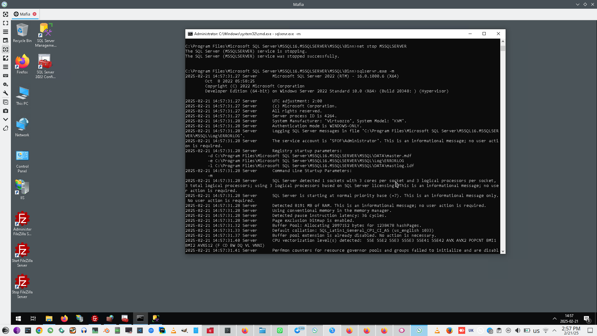 And main points, I forget take screenshots, but logic is there - you need to start server in command line, set server in single-user mode, than add this fucking account (what is not really Administrator because domain policy restrict it for ordinary user) and than switch server to multi-user mode. And restarting also is more usable in command line, because you can see clear errors. So: