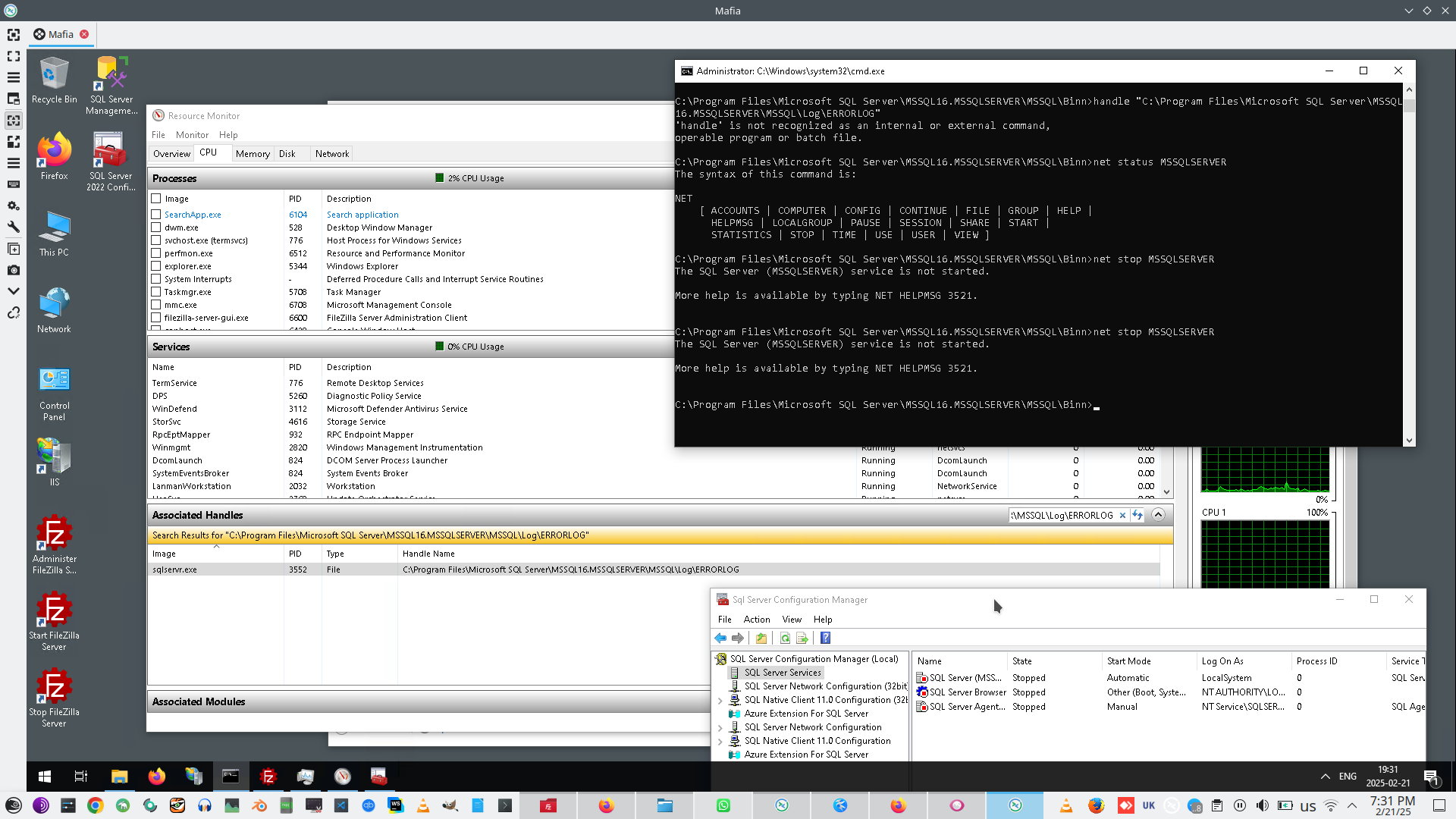 Than we need to select account for SQL service and start SQL service in command line. But be careful, if SQL server failed - ErrorLog will still busy.