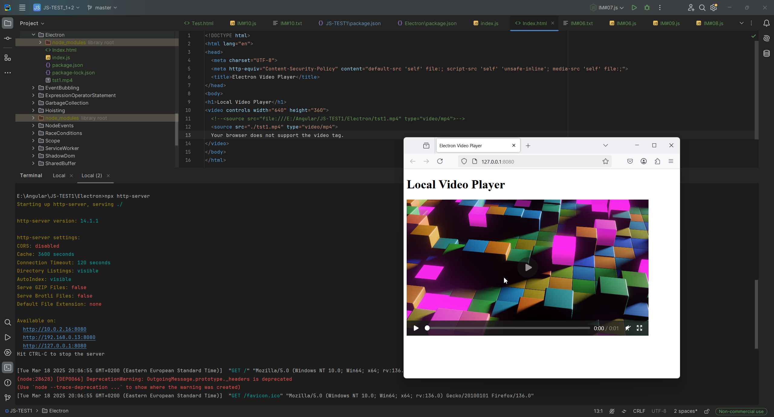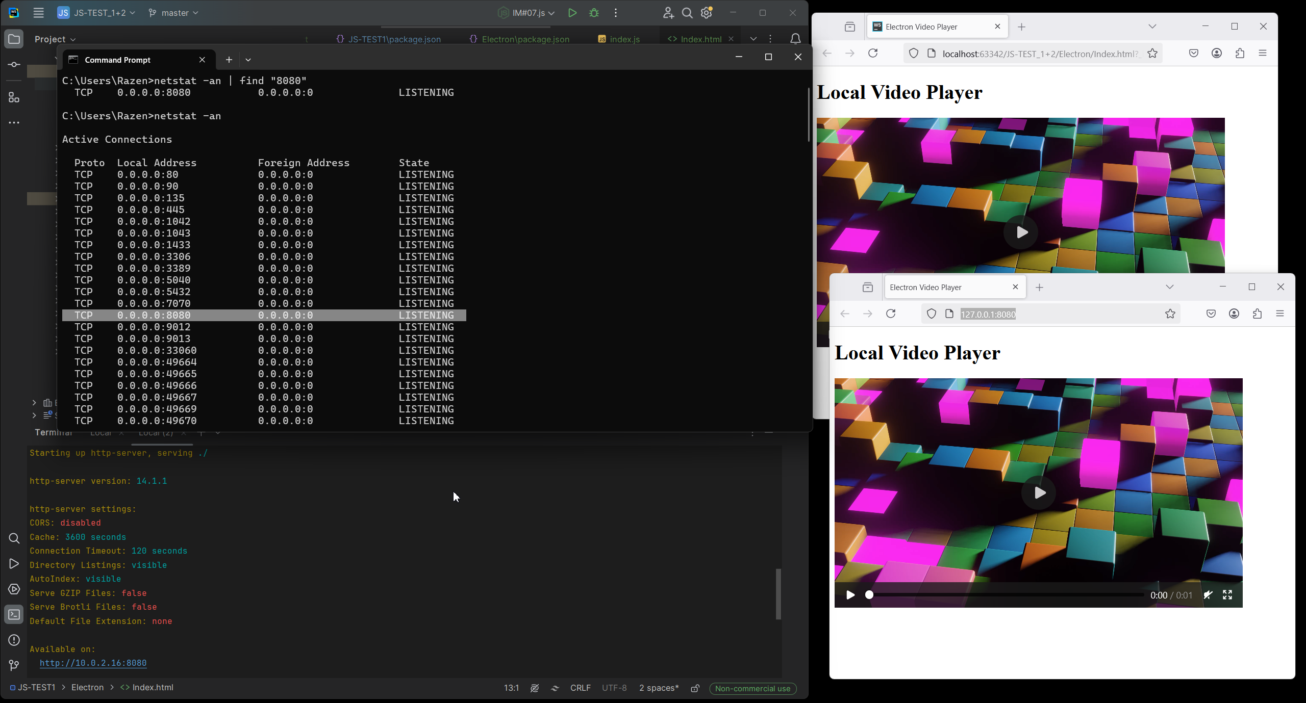 Also I have started separate Node.JS Video server process that read local video file and send it to port 5050, where Browser expect vide stream.
