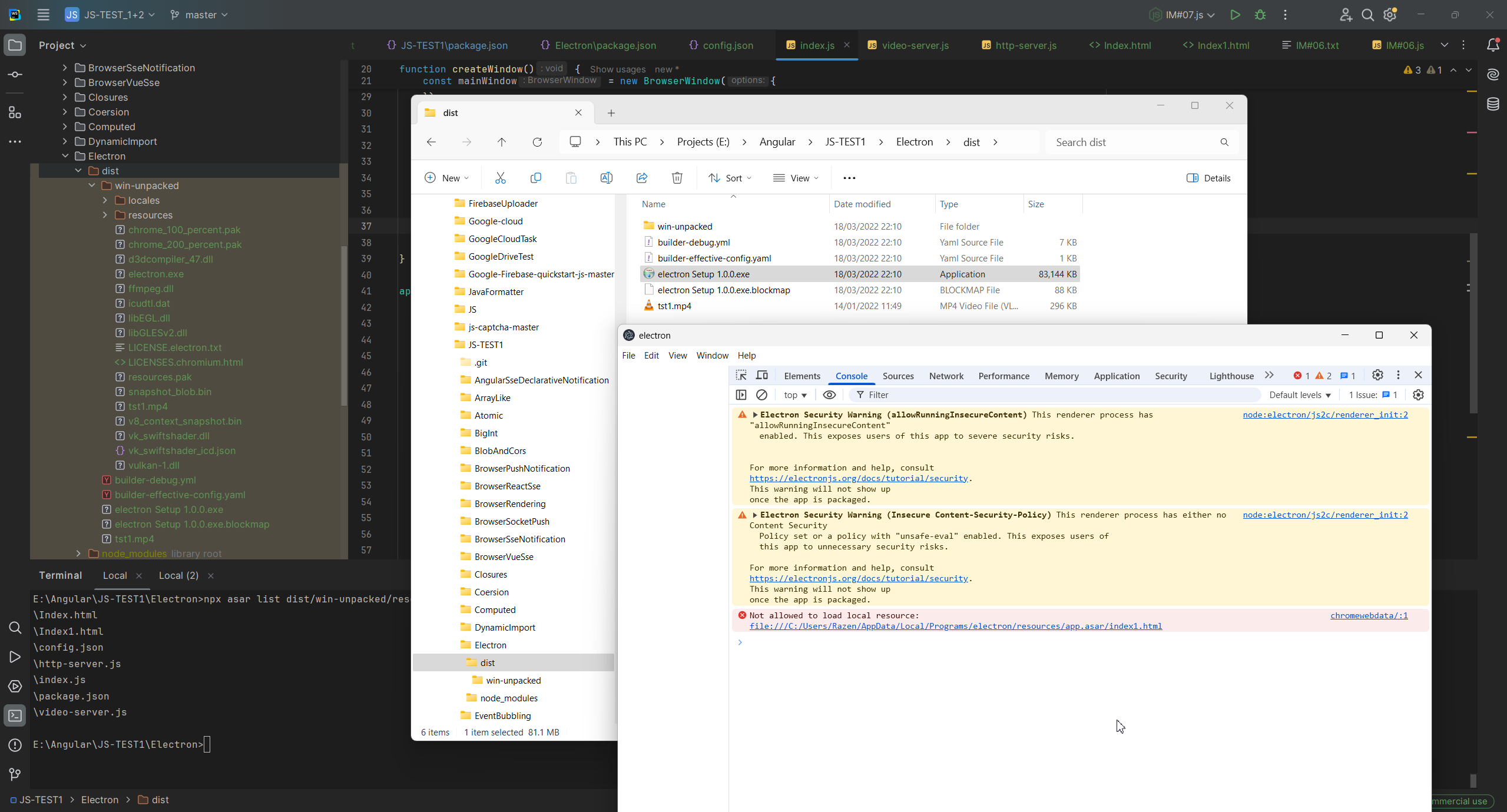 In this case Electron application working fine, but result of compilation to native desktop application faced with Content-Security-Policy restriction. This is most difficult trouble for me, and I never can clearly resolve this trouble - Electron video player with cashing and CSP policy, but this is another question. Many application can working without access to local resource, in this case Browser engine restriction not applicable.