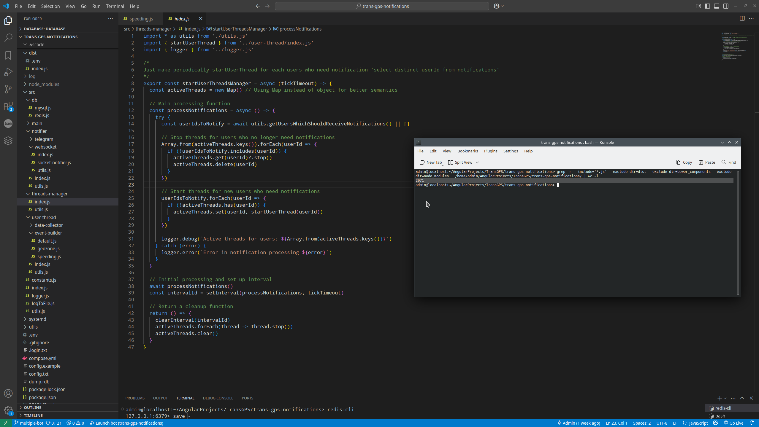 My last Node project is refactoring sophisticated multithreading Telegram bot with 3,000 code lines.