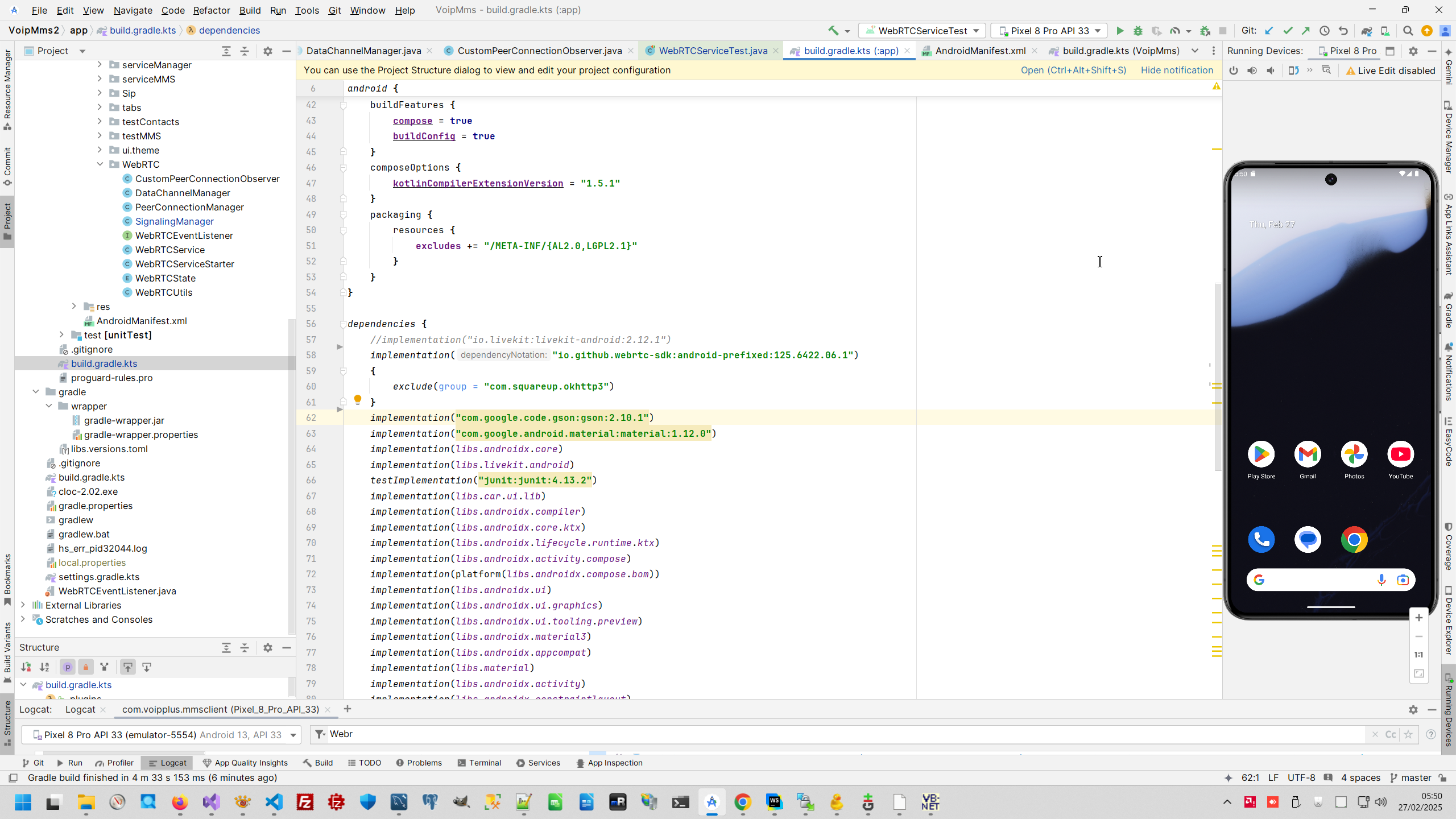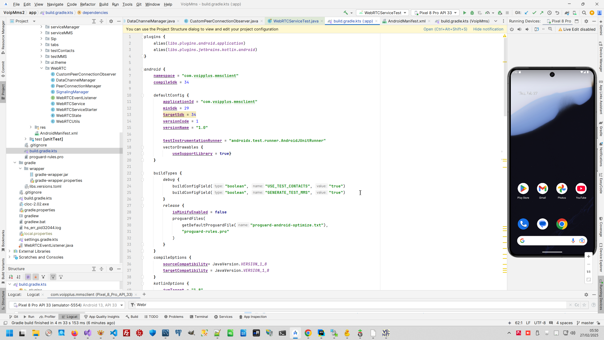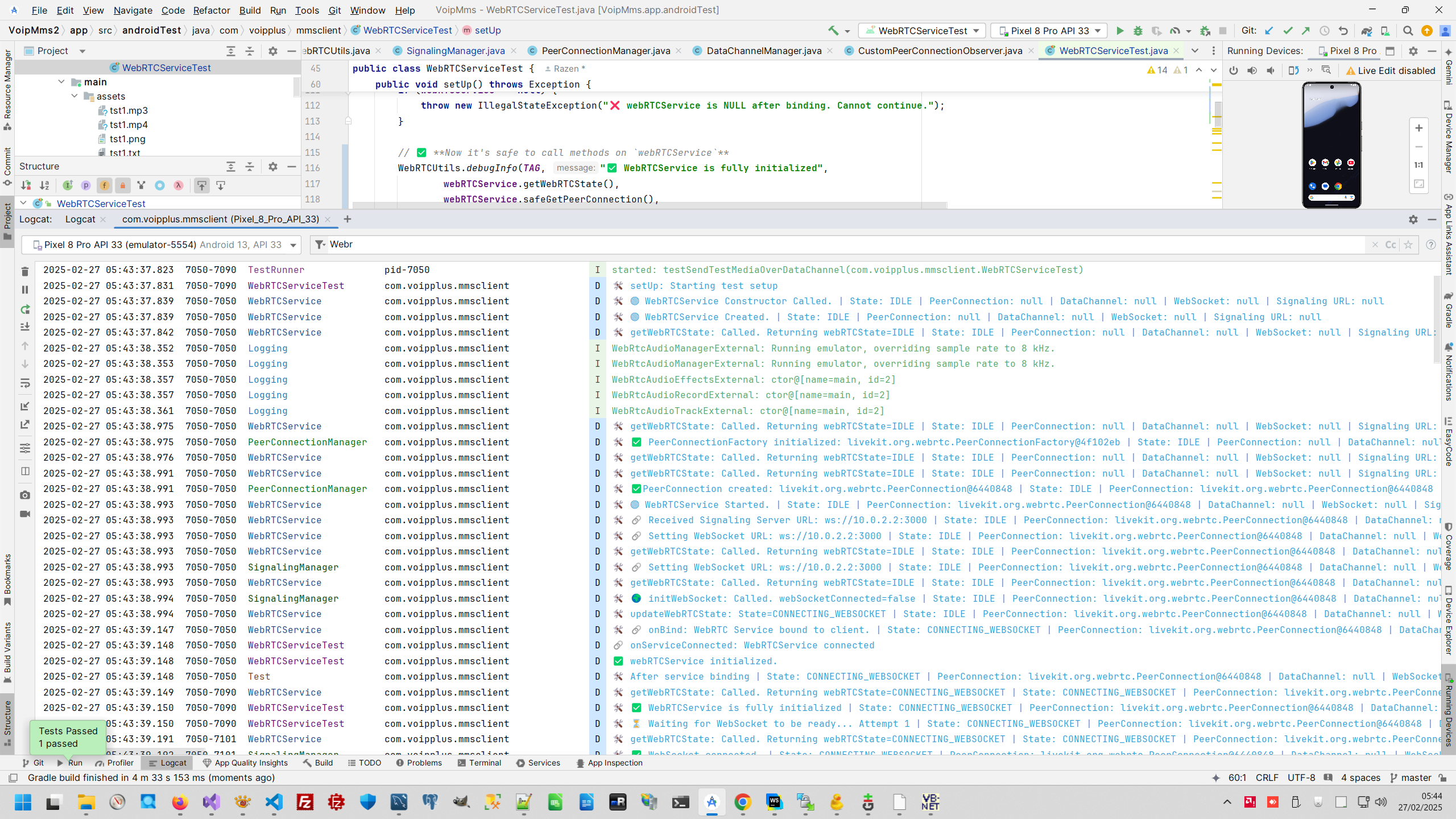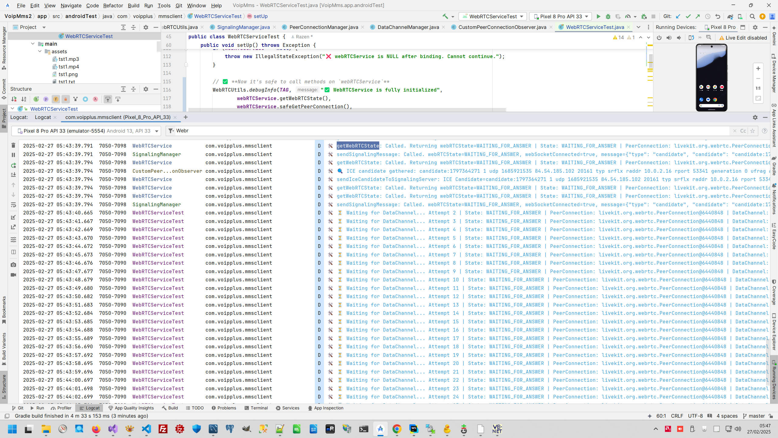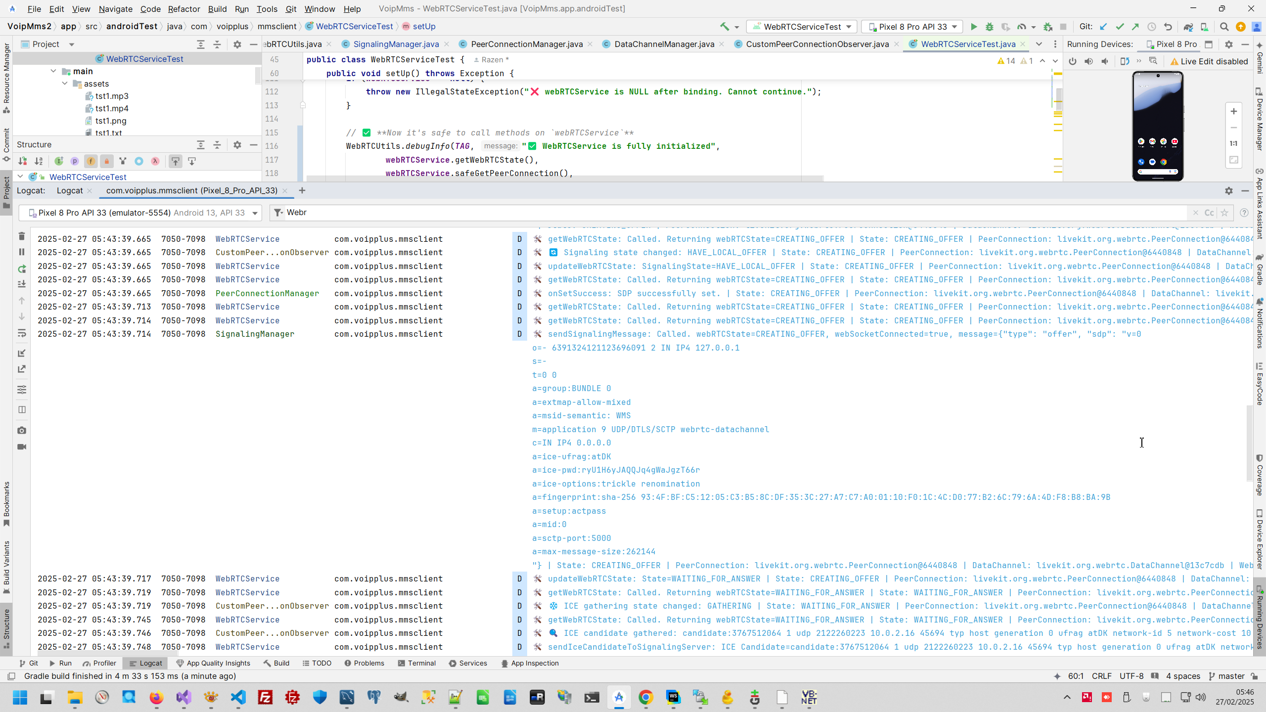 This project was terminated by customer's financial reason (he has no enough money to complete this project), therefore this component still don't working correctly, however you can see in this example my approach to create WebRTC Android application