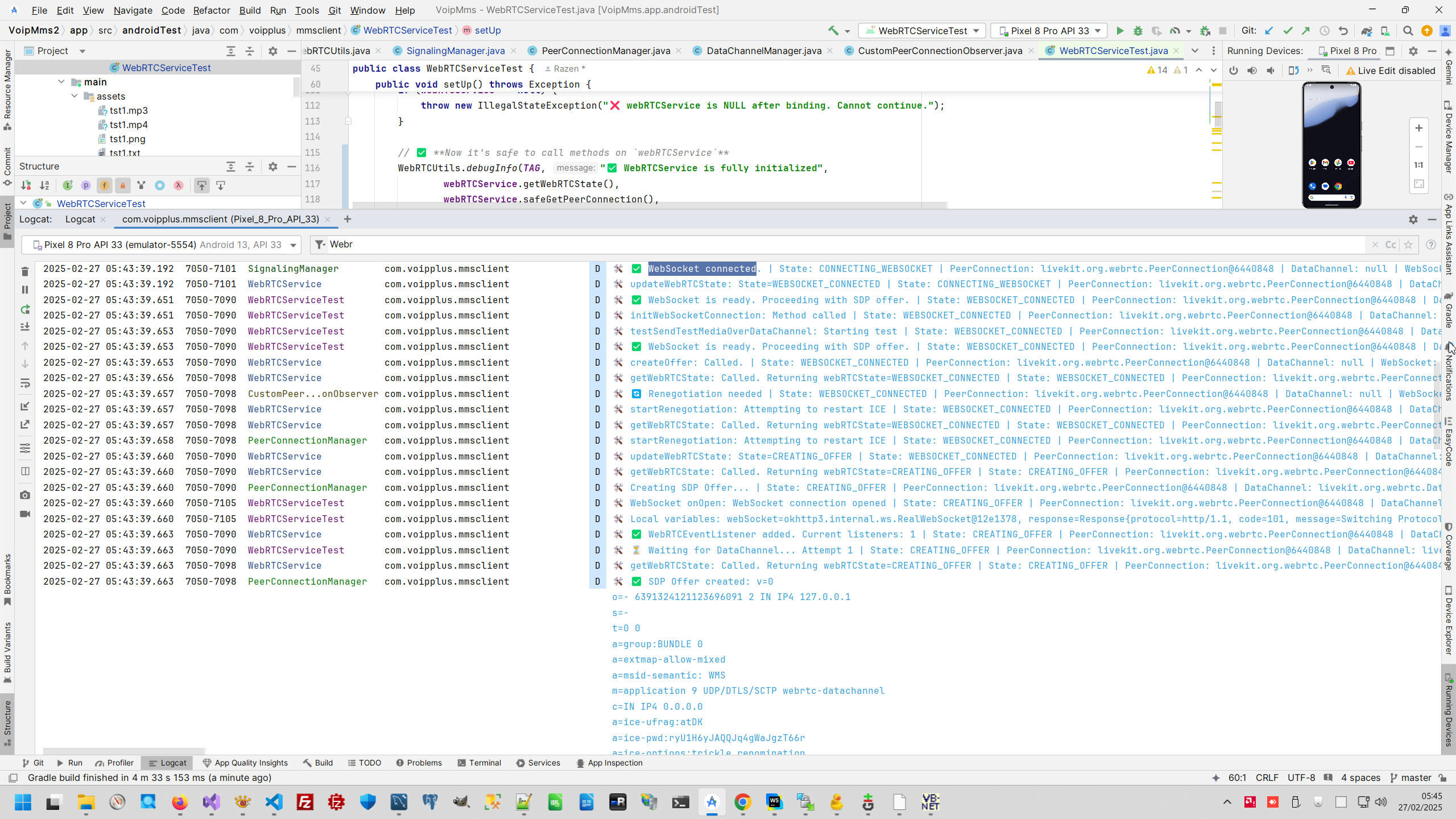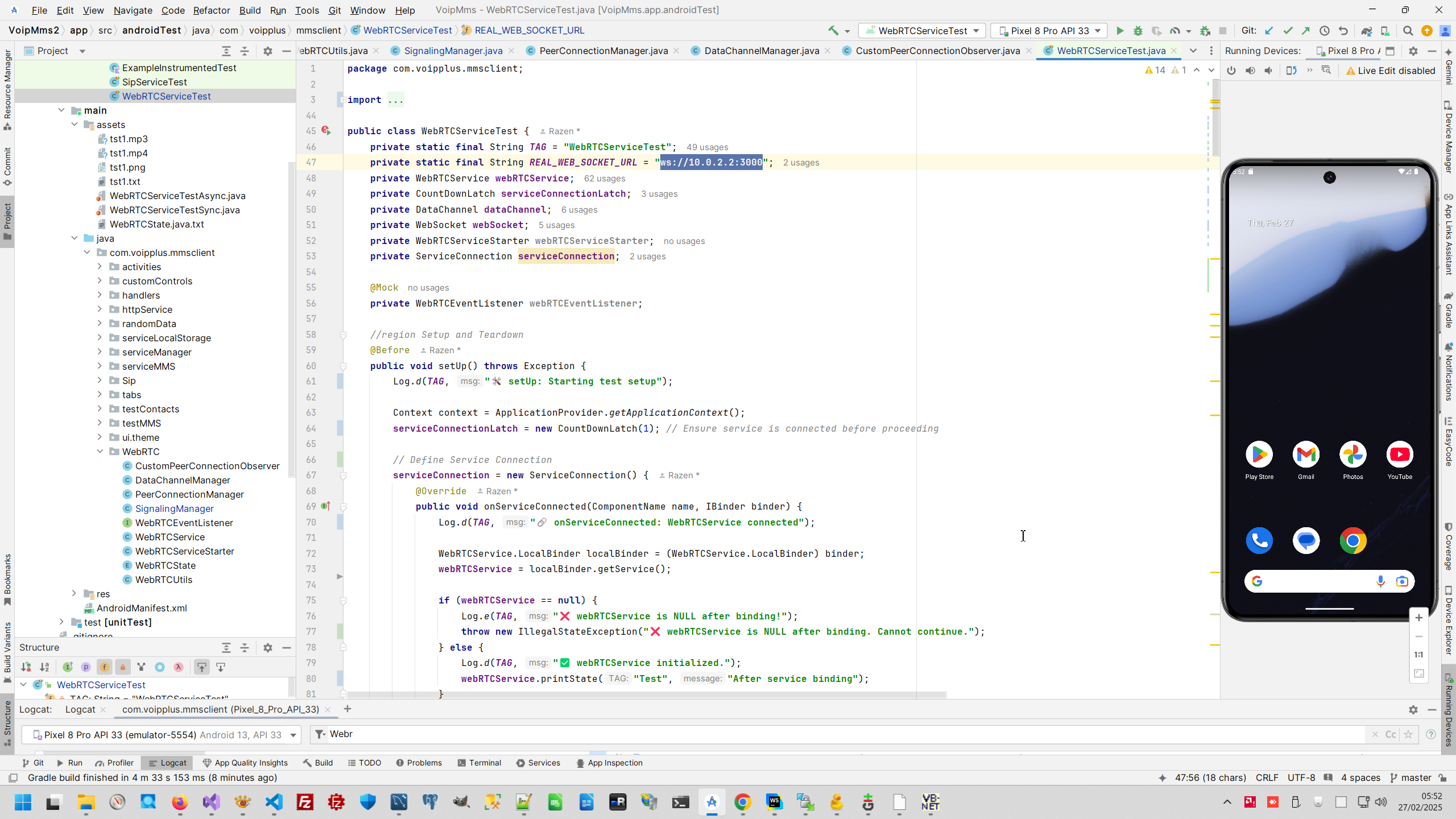 So, firstly, I have WebRTC test peer, what I used for debugging many of my WebRTC application, I mention this test peer in ths post My new project with WebRTC, what is WebRTC?, however for this test that test peer was changed (for example to enforce fixed datachannel name "testDataChannel" and many other changing). This test peer started on the local developer's computer and accessible from Android as REAL_WEB_SOCKET_URL = "ws://10.0.2.2:3000".