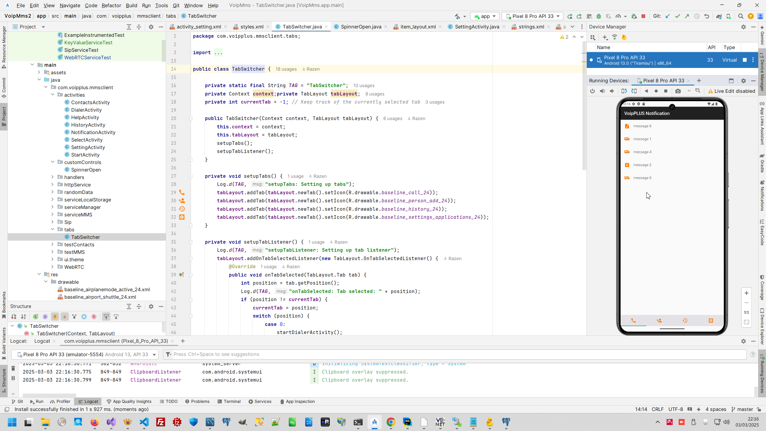 There are a lot of way to create TabSwitcher, more useful way is Fragment, but in current application I have selected another way, I have created own TabSwitcher class based on standard TabLayout class: