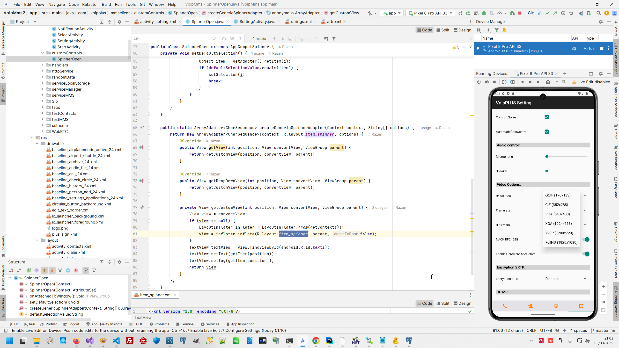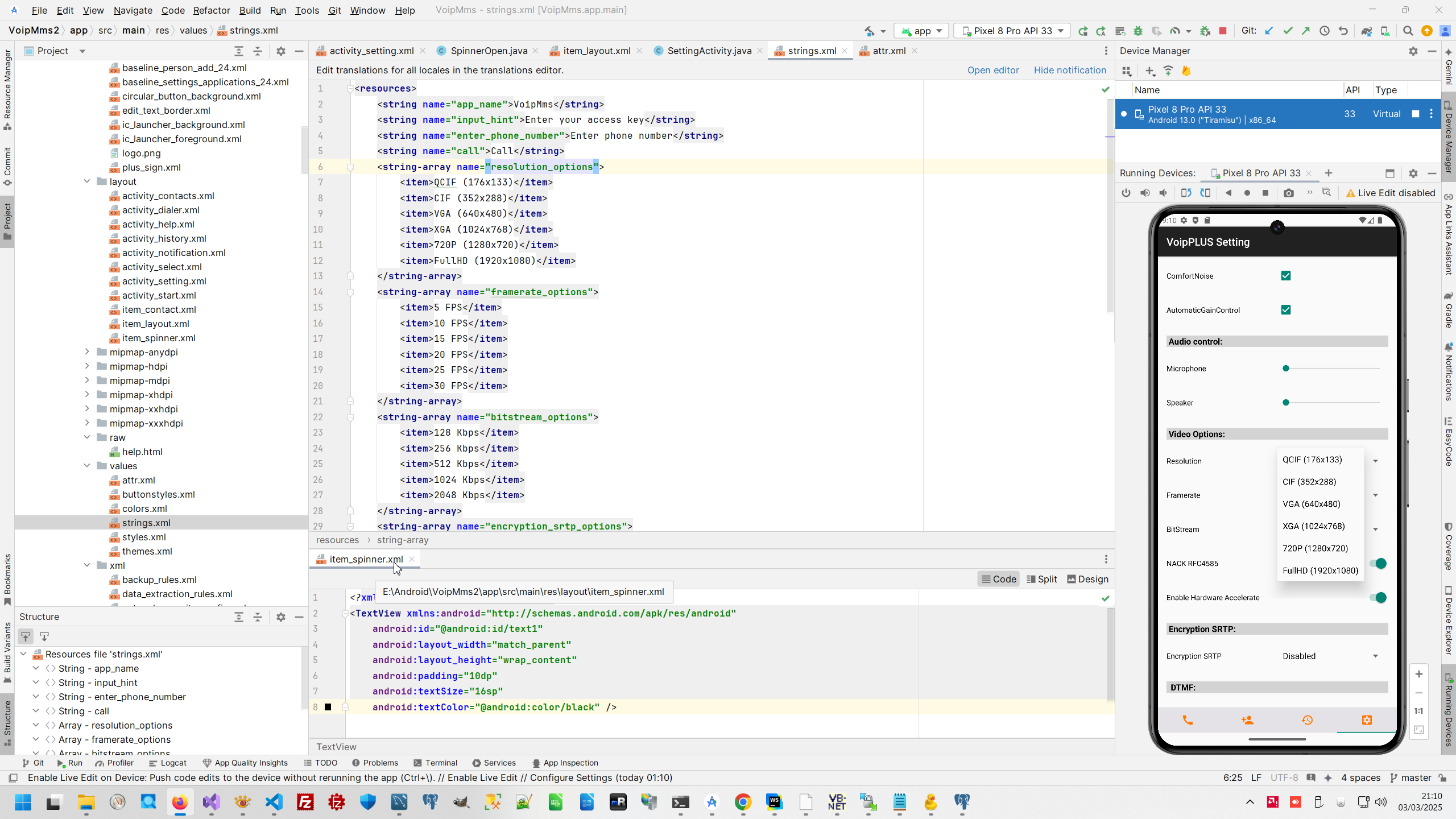- Each item define as text array in strings.xml and show as item_spinner.xml