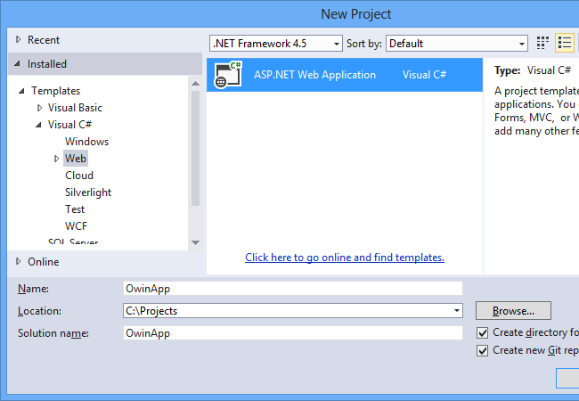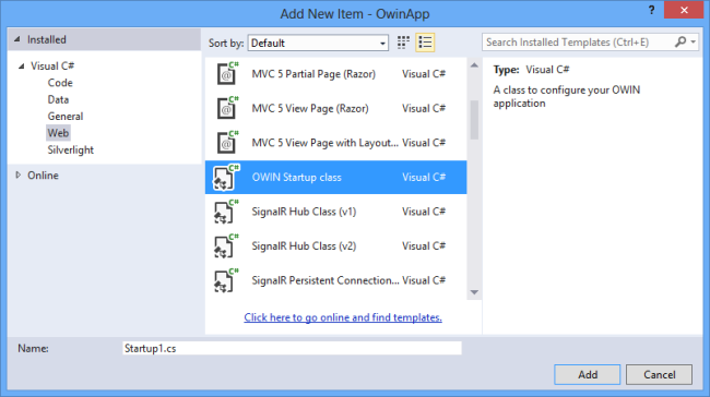 [!NOTE] The OWIN Startup class template is available in Visual Studio 2013. If you are using Visual Studio 2012, just add a new empty class named