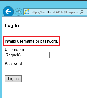 TheUserManager.Findmethod will return null and the error message: " Invalid user name or password " will be displayed.
