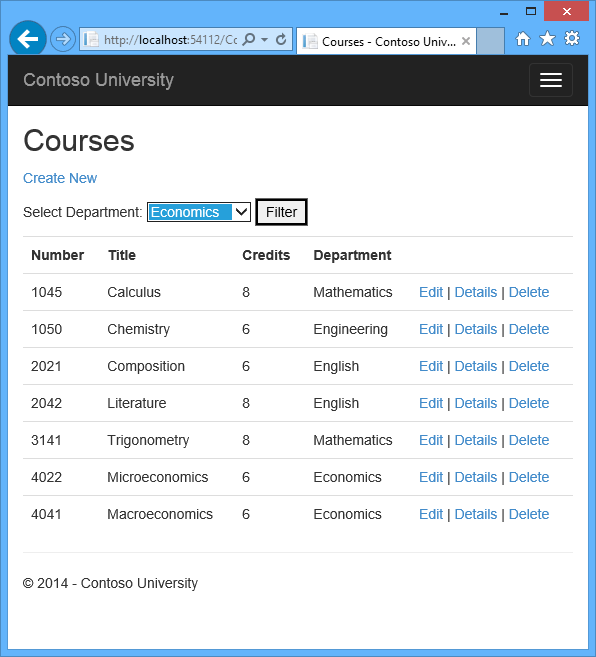 The Contoso University sample web application demonstrates how to create ASP.NET MVC 5 applications using the Entity Framework 6 Code First and Visual Studio 2013. For information about the tutorial series, see the first tutorial in the series.