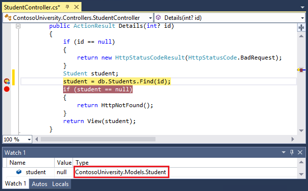 The DbSet<TEntity> class provides a method that you can use to execute a query that returns an entity of type TEntity. To see how this works you’ll change the code in the Details method of the Department controller.