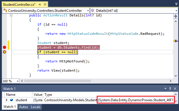 When the Entity Framework creates entity instances (for example, when you execute a query), it often creates them as instances of a dynamically generated derived type that acts as a proxy for the entity. For example, see the following two debugger images. In the first image, you see that the student variable is the expected Student type immediately after you instantiate the entity. In the second image, after EF has been used to read a student entity from the database, you see the proxy class.
