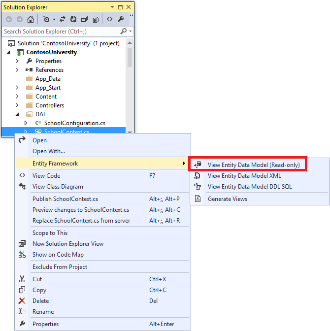Entity Framework Power Tools is a Visual Studio add-in that was used to create the data model diagrams shown in these tutorials. The tools can also do other function such as generate entity classes based on the tables in an existing database so that you can use the database with Code First. After you install the tools, some additional options appear in context menus. For example, when you right-click your context class in Solution Explorer, you get an option to generate a diagram. When you’re using Code First you can’t change the data model in the diagram, but you can move things around to make it easier to understand.