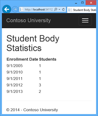Earlier you created a student statistics grid for the About page that showed the number of students for each enrollment date. The code that does this in HomeController.cs uses LINQ: