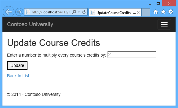 Suppose Contoso University administrators want to be able to perform bulk changes in the database, such as changing the number of credits for every course. If the university has a large number of courses, it would be inefficient to retrieve them all as entities and change them individually. In this section you’ll implement a web page that enables the user to specify a factor by which to change the number of credits for all courses, and you’ll make the change by executing a SQL UPDATE statement. The web page will look like the following illustration: