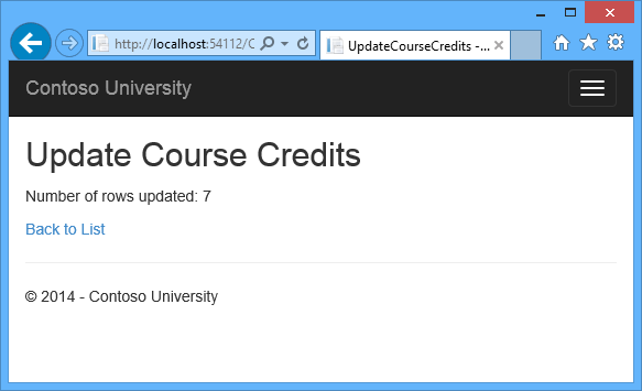 When the Update button is clicked, the HttpPost method is called, and multiplier has the value entered in the text box. The code then executes the SQL that updates courses and returns the number of affected rows to the view in the ViewBag.RowsAffected variable. When the view gets a value in that variable, it displays the number of rows updated instead of the text box and submit button, as shown in the following illustration: