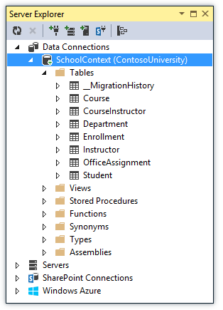 Open the database in Server Explorer as you did earlier, and expand the Tables node to see that all of the tables have been created. (If you still have Server Explorer open from the earlier time, click the Refresh button.)