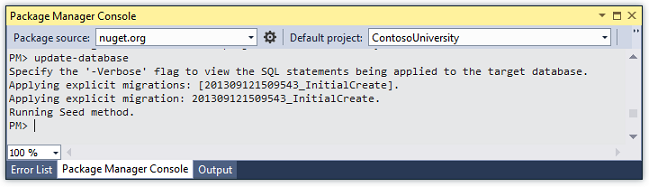 The update-database command runs the Up method to create the database and then it runs the Seed method to populate the database. The same process will run automatically in production after you deploy the application, as you’ll see in the following section.