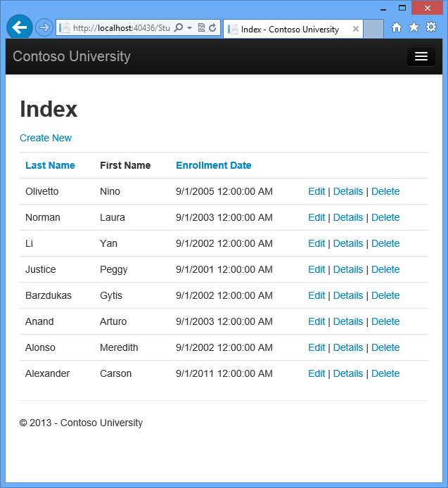 The Contoso University sample web application demonstrates how to create ASP.NET MVC 5 applications using the Entity Framework 6 Code First and Visual Studio 2013. For information about the tutorial series, see the first tutorial in the series.