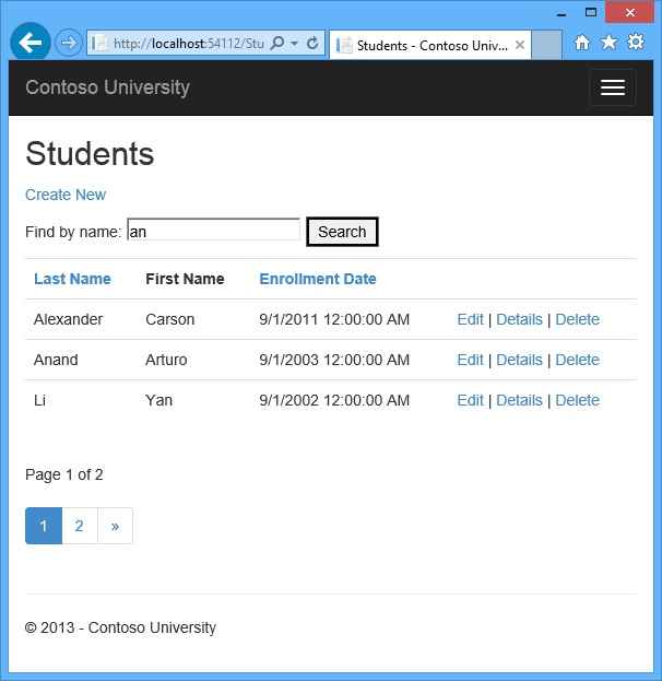 In the previous tutorial you implemented a set of web pages for basic CRUD operations for Student entities. In this tutorial you’ll add sorting, filtering, and paging functionality to the Students Index page. You’ll also create a page that does simple grouping.