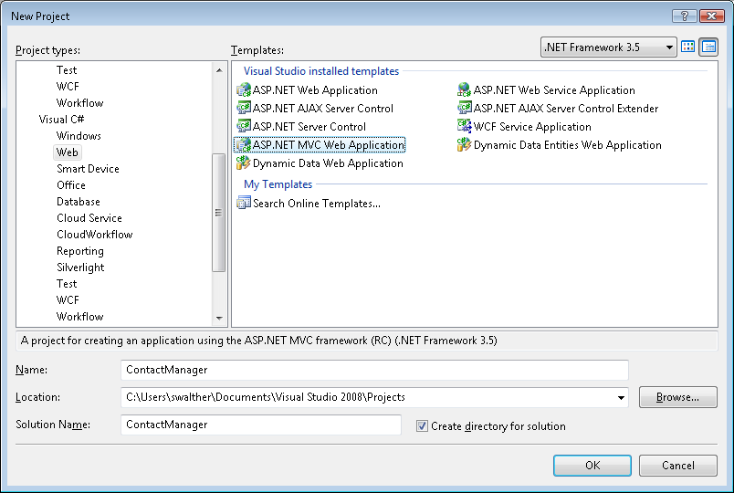 ASP.NET MVC Web Application Project. Launch Visual Studio and select the menu option File, New Project. The New Project dialog appears (see Figure 1). Select the Web project type and the ASP.NET MVC Web Application template. Name your new project ContactManager and click the OK button.