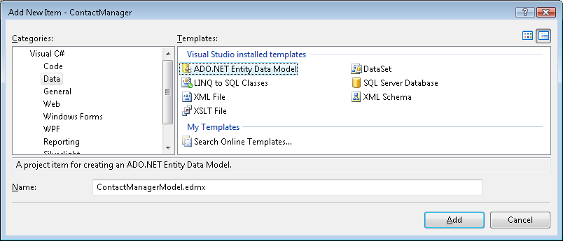 - Select the Data category and the ADO.NET Entity Data Model template. Name your data model ContactManagerModel.edmx and click the Add button. The Entity Data Model wizard appears (see Figure 7).