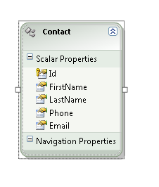 The Entity Data Model wizard generates class names based on database table names. You almost always need to change the name of the class generated by the wizard. Right-click the Contacts class in the designer and select the menu option Rename. Change the name of the class from Contacts (plural) to Contact (singular). After you change the class name, the class should appear like Figure 10.