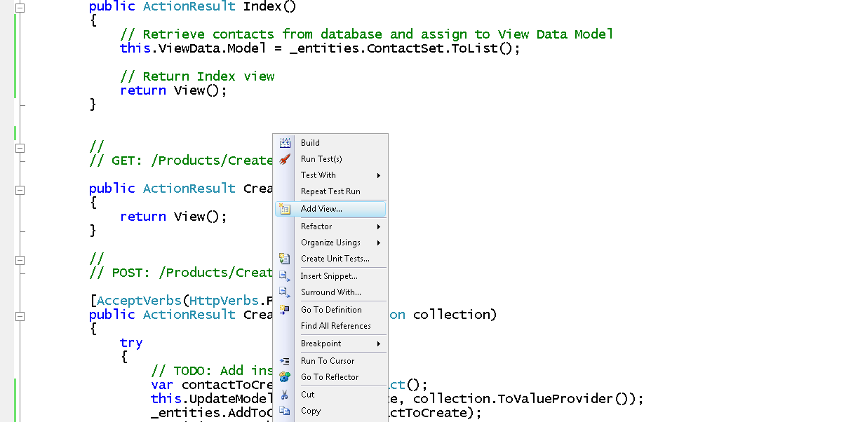 The ASP.NET MVC application consists of Models, Views, and Controllers. We start by creating a Model class that represents the Contacts table that we created in the previous section.