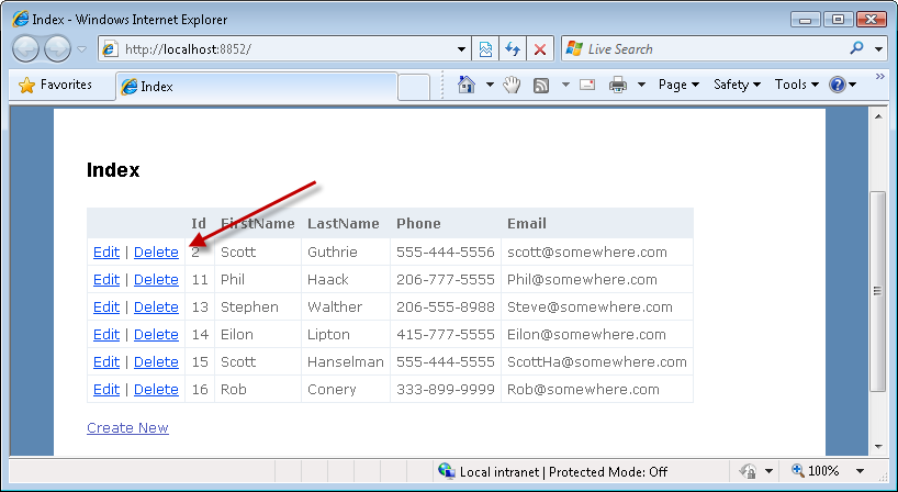 We need to modify the Index view so that it contains a link for deleting contact records (see Figure 21). You need to add the following code to the same table cell that contains the Edit link: