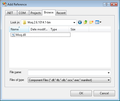 - Add a reference to the Moq assembly to your Test project by selecting the menu option Project, Add Reference to open the Add Reference dialog. Under the Browse tab, browse to the folder where you unzipped Moq and select the Moq.dll assembly. Click the OK button (see Figure 2).