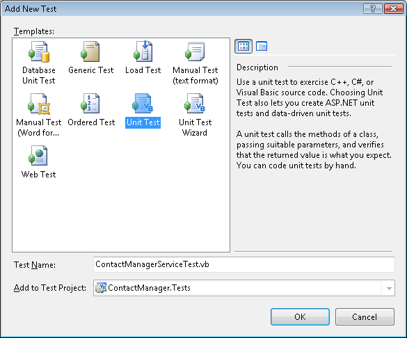 Create a new folder named Models in the ContactManager.Tests project. Next, right-click the Models folder and select Add, New Test. The Add New Test dialog shown in Figure 3 appears. Select the Unit Test template and name your new test ContactManagerServiceTest.vb. Click the OK button to add your new test to your Test Project.
