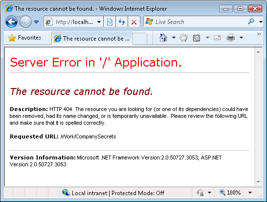 If you attempt to invoke the CompanySecrets() controller action by typing /Work/CompanySecrets into the address bar of your browser then you’ll get the error message in Figure 1.