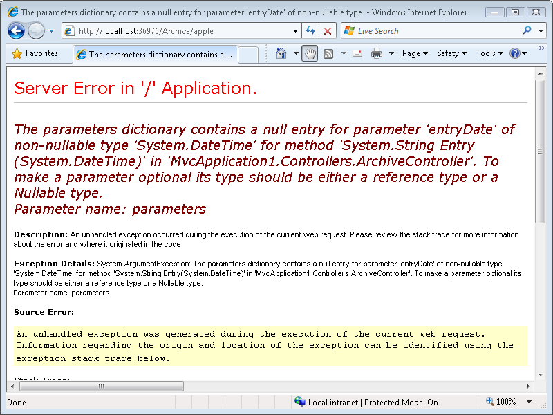 Notice that the Entry() method in Listing 2 accepts a parameter of type DateTime. The MVC framework is smart enough to convert the entry date from the URL into a DateTime value automatically. If the entry date parameter from the URL cannot be converted to a DateTime, an error is raised (see Figure 1).
