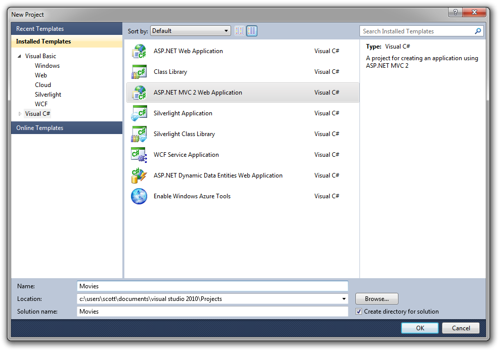You can create applications using Visual Basic or Visual C#. For now, Select Visual C# on the left, then pick “ASP.NET MVC 2 Web Application.” Name your project “Movies” and click OK.