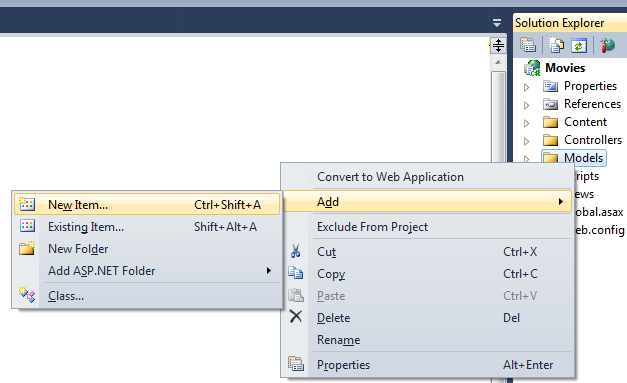 Now, switch back to the Solution Explorer on the right hand side of the IDE and right-click on the Models folder and select Add | New Item.
