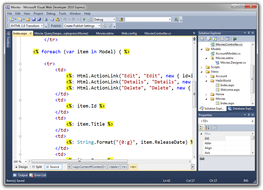 We won’t be implementing Edit, Details and Delete functionality with this application - so we don’t need the default links that the scaffold template created for us. Open up the /Movies/Index.aspx file and remove them.