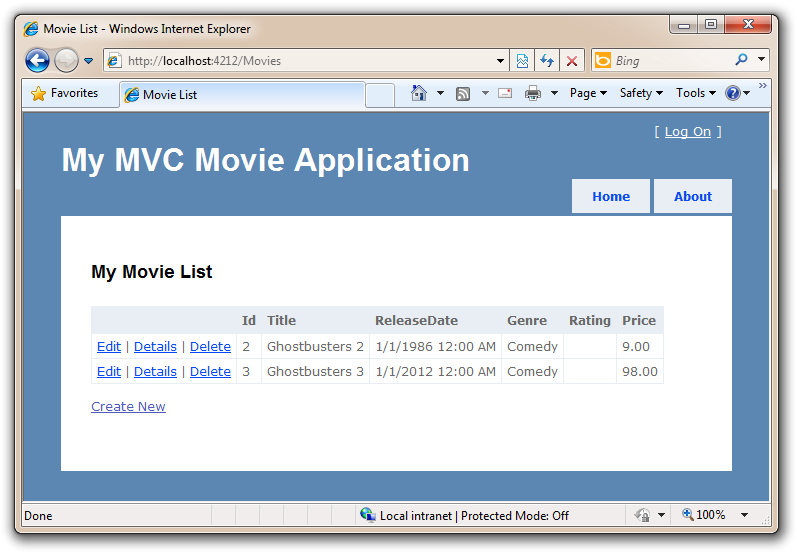We now have a simple listing of our movie data. However, if we click the “Create New” link, we’ll get an error as it’s not hooked up! Let’s implement a Create Action method and enable a user to enter new movies in our database.