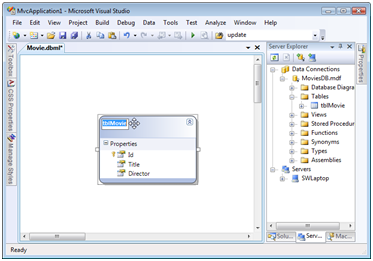 Immediately after you create the Movie LINQ to SQL Classes, the Object Relational Designer appears. You can drag database tables from the Server Explorer window onto the Object Relational Designer to create LINQ to SQL Classes that represent particular database tables. We need to add the tblMovie database table onto the Object Relational Designer (see Figure 5).
