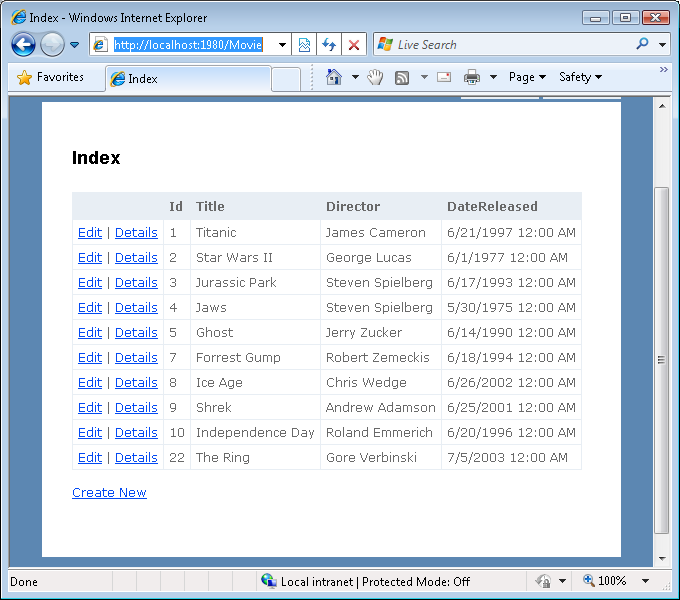 If you don’t like anything about the appearance of the grid of database records in Figure 7 then you can simply modify the Index view. For example, you can change the DateReleased header to Date Released by modifying the Index view.