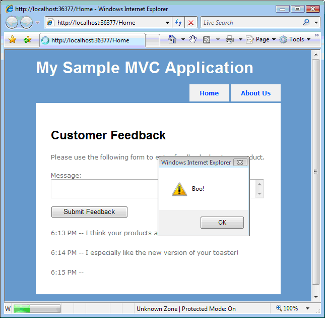 Imagine that you have created a customer feedback website (see Figure 1). Customers can visit the website and enter feedback on their experience using your products. When a customer submits their feedback, the feedback is redisplayed on the feedback page.
