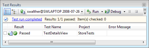 You can run the unit test in Listing 2 by either entering the keyboard combination Ctrl-R, A or by clicking the Run All Tests in Solution button (see Figure 1). If the test passes, you’ll see the Test Results window in Figure 2.