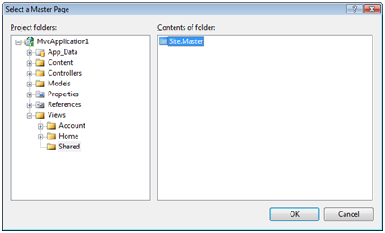 After you click the Add button, a new dialog appears that enables you to select a view master page to associate with the view content page (see Figure 4). You can navigate to the Site.master view master page that we created in the previous section.