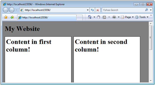 When the view in Listing 3 is requested, it renders the page in Figure 5. Notice that the view renders a page with two columns. Notice, furthermore, that the content from the view content page is merged with the content from the view master page