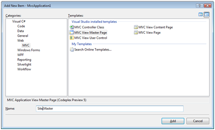 Let’s start by creating a view master page that defines a two-column layout. You add a new view master page to an MVC project by right-clicking the Viewsfolder, selecting the menu option Add, New Item, and selecting the MVC View Master Page template (see Figure 1).