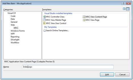 After you create a view master page, you can create one or more view content pages based on the view master page. For example, you can create an Index view content page for the Home controller by right-clicking the Viewsfolder, selecting Add, New Item, selecting the MVC View Content Page template, entering the name Index.aspx, and clicking the Add button (see Figure 3).