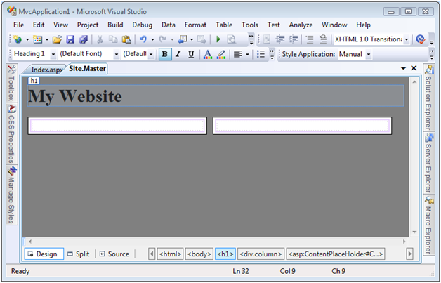 The body of the view master page in Listing 1 contains two <div> tags that correspond to the two columns. The Cascading Style Sheet column class is applied to both <div> tags. This class is defined in the style sheet declared at the top of the master page. You can preview how the view master page will be rendered by switching to Design view. Click the Design tab at the bottom-left of the source code editor (see Figure 2).