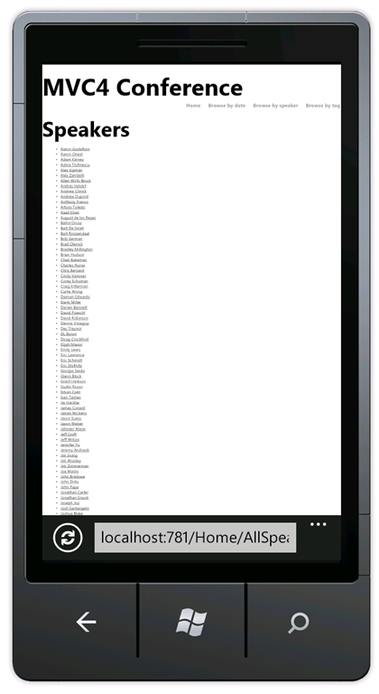 Press CTRL+F5 to run the application, which will display it in your desktop browser. Start your mobile browser emulator, copy the URL for the conference application into the emulator, and then click the Browse by tag link. If you are using the Windows Phone Emulator, click in the URL bar and press the Pause key to get keyboard access. The image below shows the AllTags view (from choosing Browse by tag).