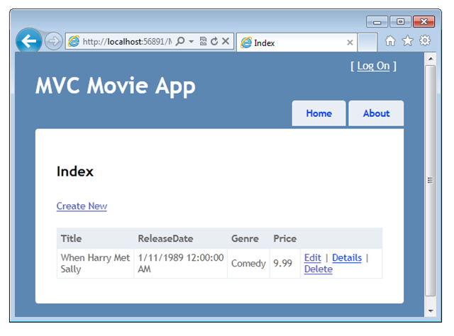Create a couple more movie entries. Try the Edit, Details, and Delete links, which are all functional.