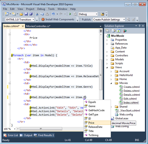 Because the Model object is strongly typed (as an IEnumerable<Movie> object), each item object in the loop is typed as Movie. Among other benefits, this means that you get compile-time checking of the code and full IntelliSense support in the code editor: