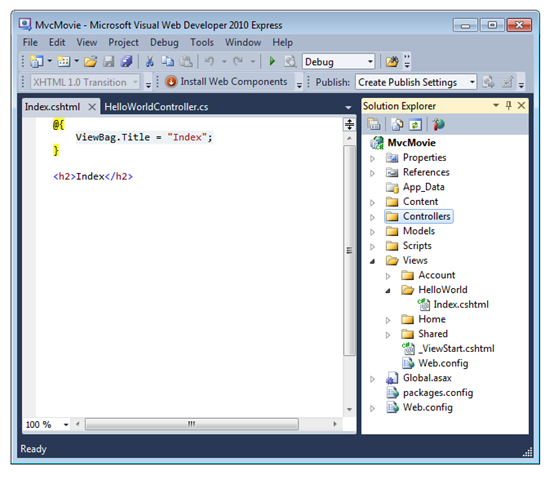 Run the application and browse to the HelloWorld controller (http://localhost:xxxx/HelloWorld). The Index method in your controller didn’t do much work; it simply ran the statement return View(), which specified that the method should use a view template file to render a response to the browser. Because you didn’t explicitly specify the name of the view template file to use, ASP.NET MVC defaulted to using the Index.cshtml view file in the *folder. The image below shows the string hard-coded in the view.