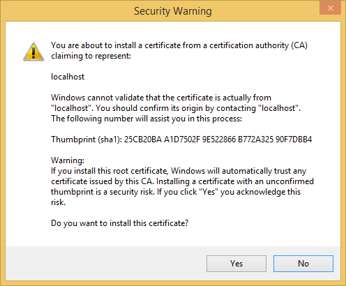 Read the Security Warning dialog and then click Yes if you want to install the certificate representing localhost.
